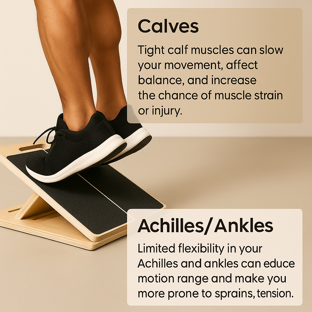 You can perform calf raises, hamstring stretches, ankle mobility drills, squats, and knee-over-toe lunges. It’s ideal for warm-ups, cool-downs, or daily mobility sessions.